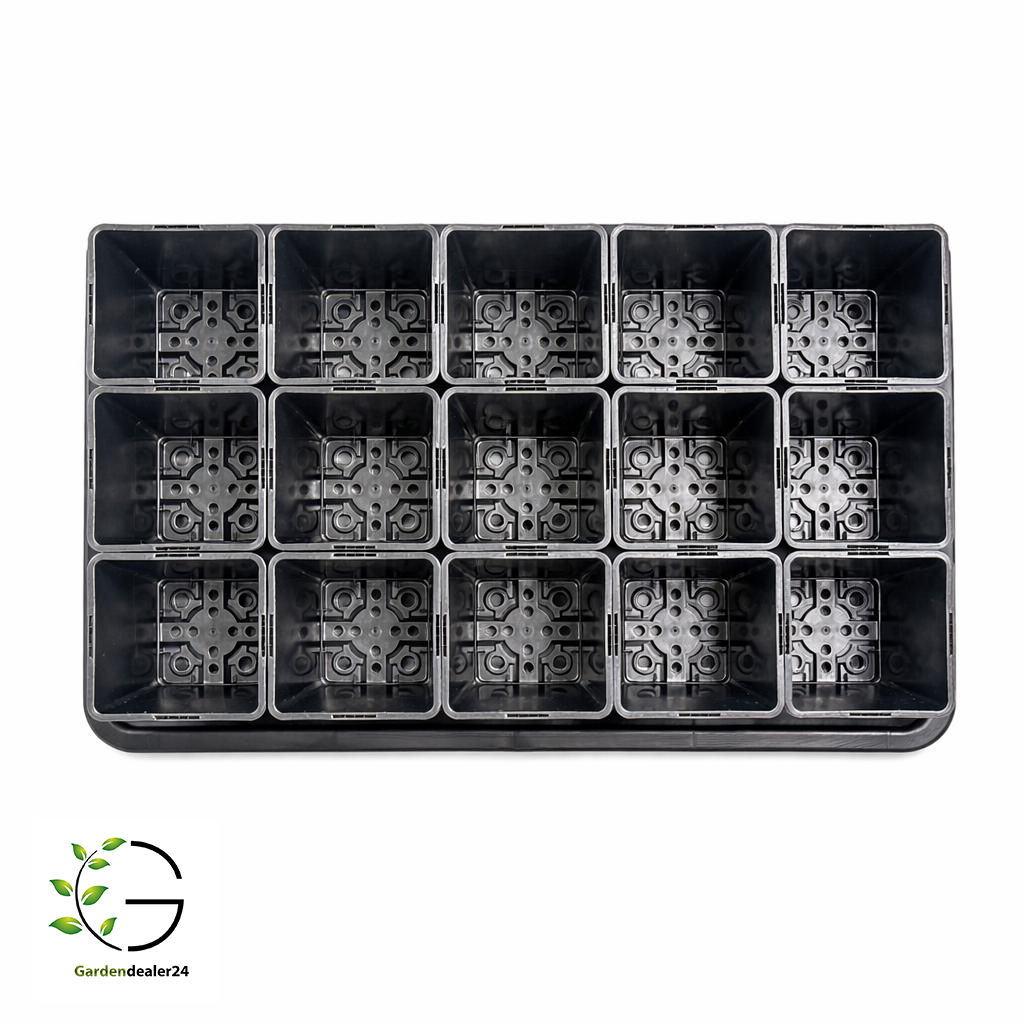 Dieses Set besteht aus 15 Anzuchttöpfen mit einem Volumen von 1,7 Litern (11x11 cm, Höhe 19 cm) und einem stabilen Untersetzer.
