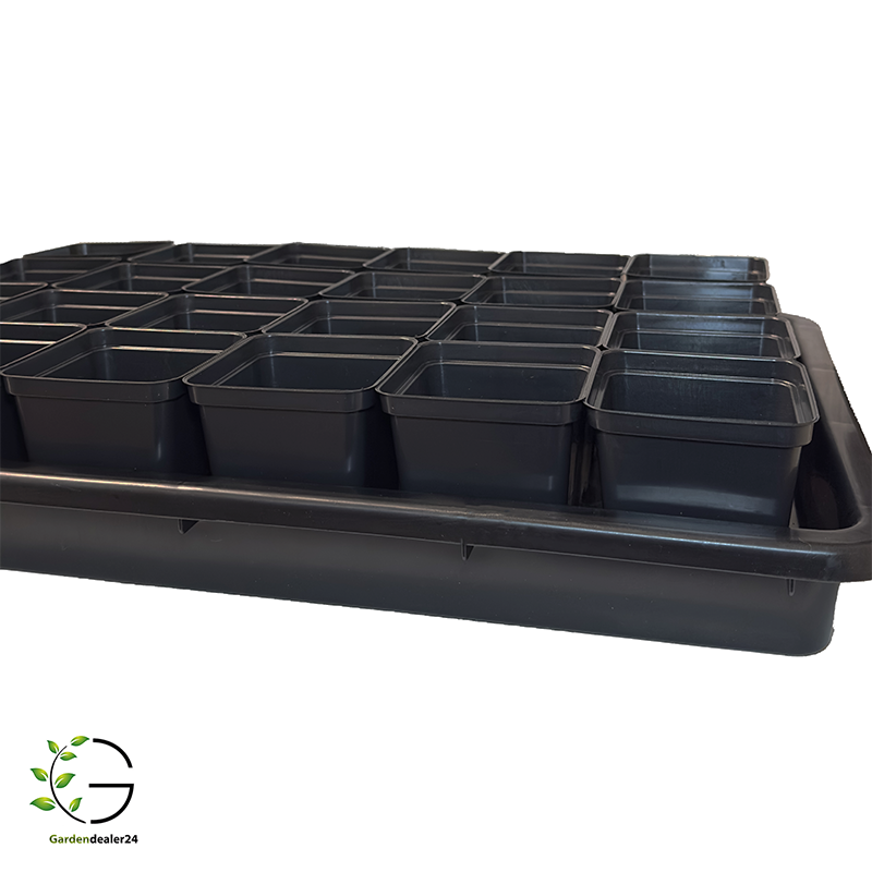 Dieses Set besteht aus 24 Anzuchttöpfen mit einem Volumen von 0,5 Litern (9x9 cm, Höhe 9,6 cm) und einem stabilen Untersetzer.